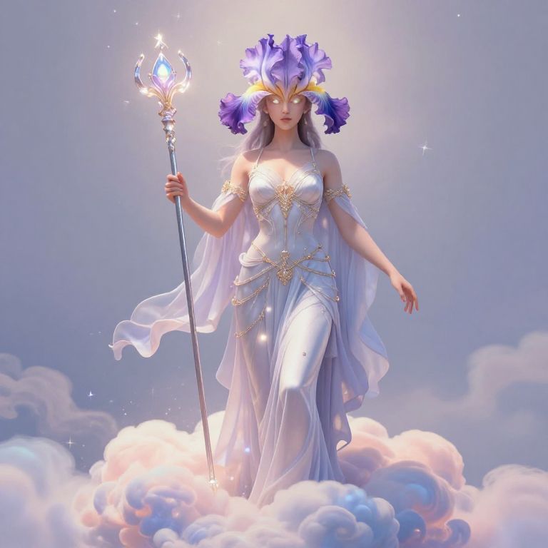 Art iris goddess standing atop clouds, with intricate iris flower crown, glowing eyes, holding a shimmering staff, detailed fantasy artwork, soft pastel colors and magical ambiance