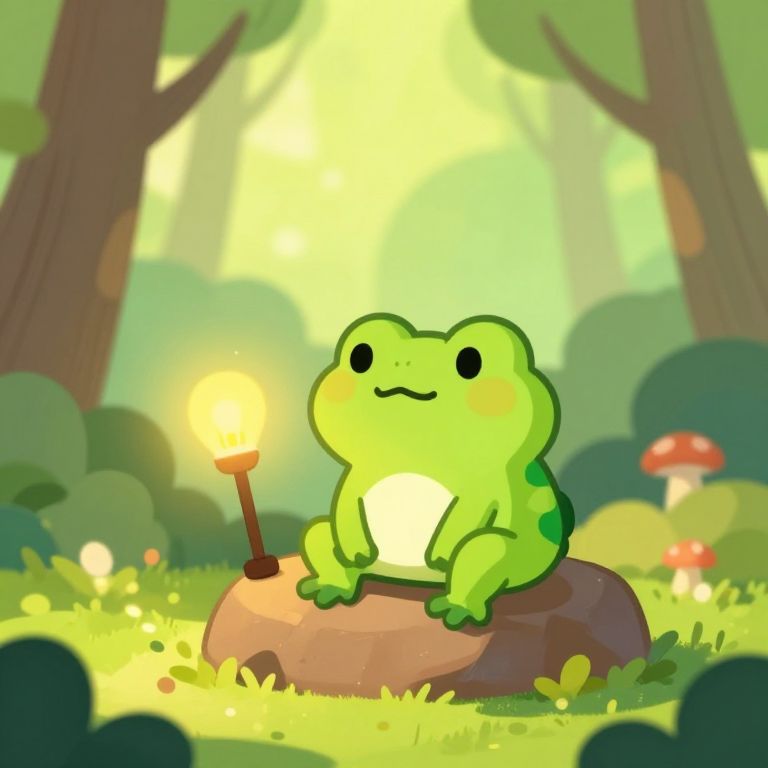 Cute frog fakemon jumping through a colorful jungle with oversized leaves, bright vibrant colors, playful expression, stylized fantasy art, detailed textures, soft natural light
