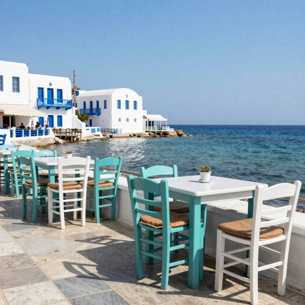 Photograph of a waterfront restaurant with tables covered in white and red tablecloths. Wooden chairs surround each table, which have plates, cutlery, and small bottles. The background shows a clear blue sea with a distant ship and colorful buildings along the shore. The bright sunlight casts sharp shadows, adding depth to the scene. The overall vibe is sunny and inviting.
