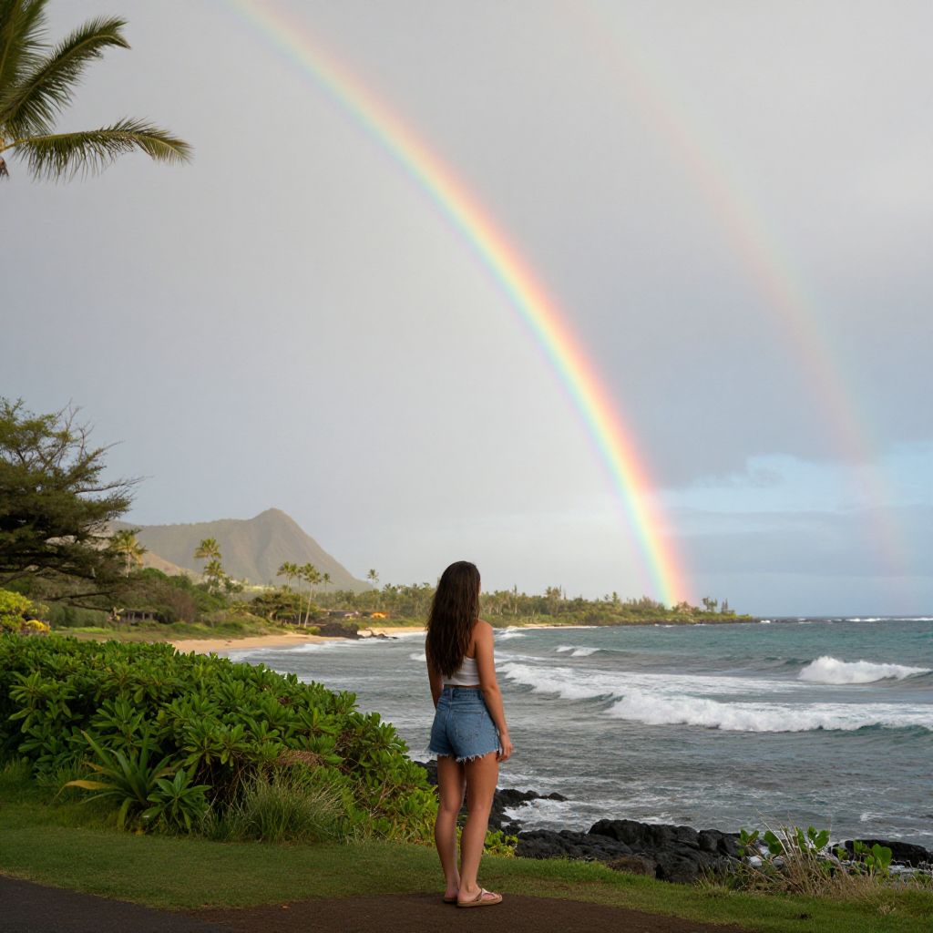 Woman standing by the ocean, gazing at a vibrant rainbow arching across the sky in Maui, Hawaii, with lush greenery and distant mountains framing the serene seascape.