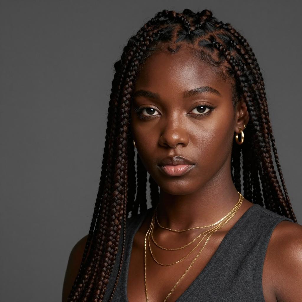 Small afro braid, photorealistic portrait of young black woman, detailed braided hairstyle with twists and curls, dark brown skin, wearing olive green t-shirt, multiple layered necklaces with turquoise pendants, teardrop earrings, neutral expression, soft brown and gold blurred background, realistic lighting, close-up, studio portrait, high detail, T2I, realistic ure, focused on face and upper body, African-inspired fashion, jewelry, confident demeanor