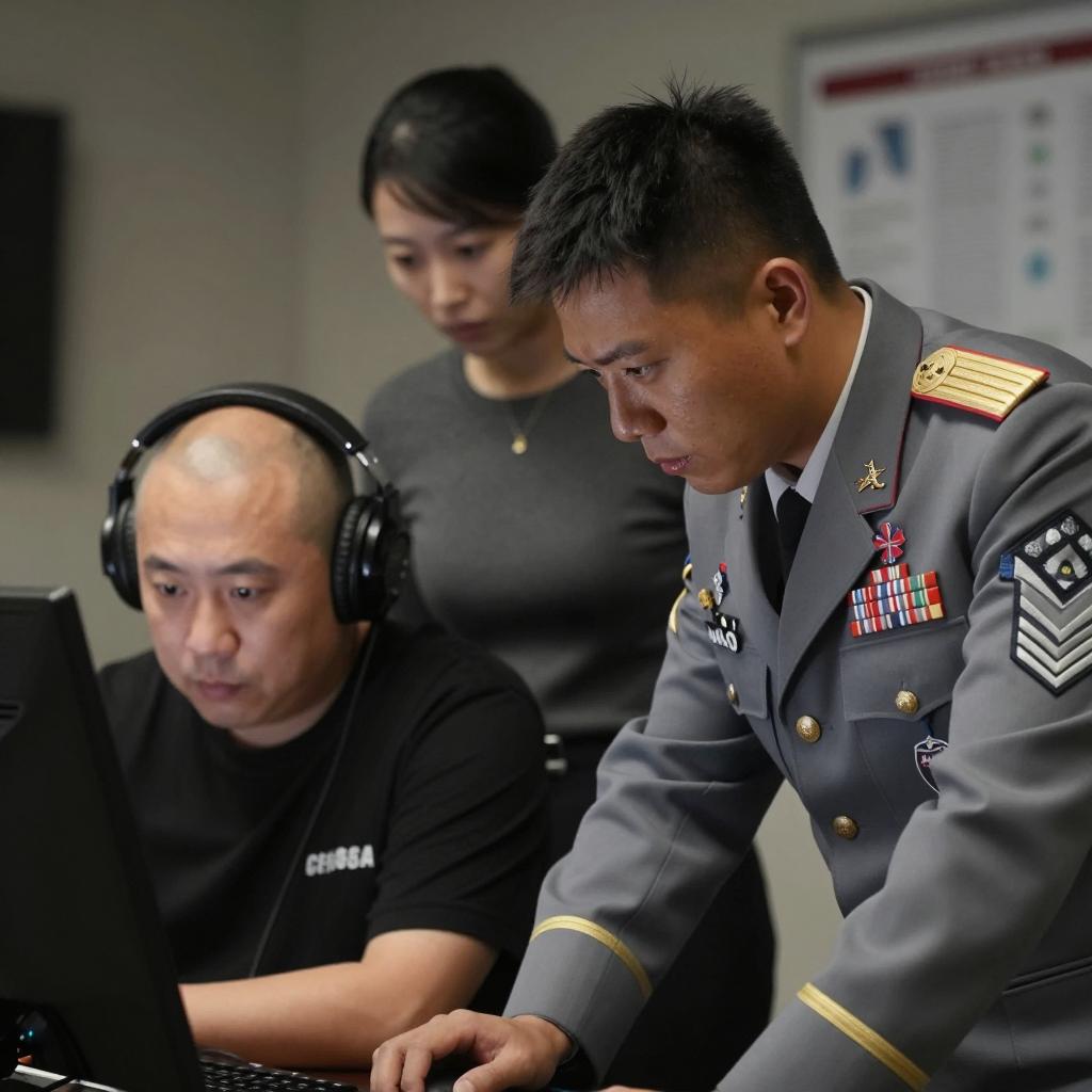Photograph of a dimly lit control room. Foreground: partially visible man with glasses, dark hair, mouth open. Background: seated man in headgear, working at desk with computer, surrounded by technical panels. Green carpet, shadowed lighting.