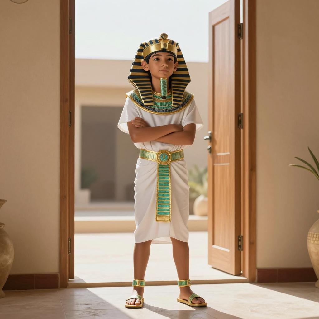 Boy greek costume, photorealistic, young boy, ancient Roman costume, standing, center frame, looking forward, neutral expression, golden headband, white and brown toga, sandals, classical architecture background, columns, golden sunburst decoration, indoor setting, soft lighting, realistic ures, potted plant on the left, stone floor, brown and beige tones, detailed clothing, child, front view, realistic shadow, portrait photography style, digital art, detailed background, realistic colors