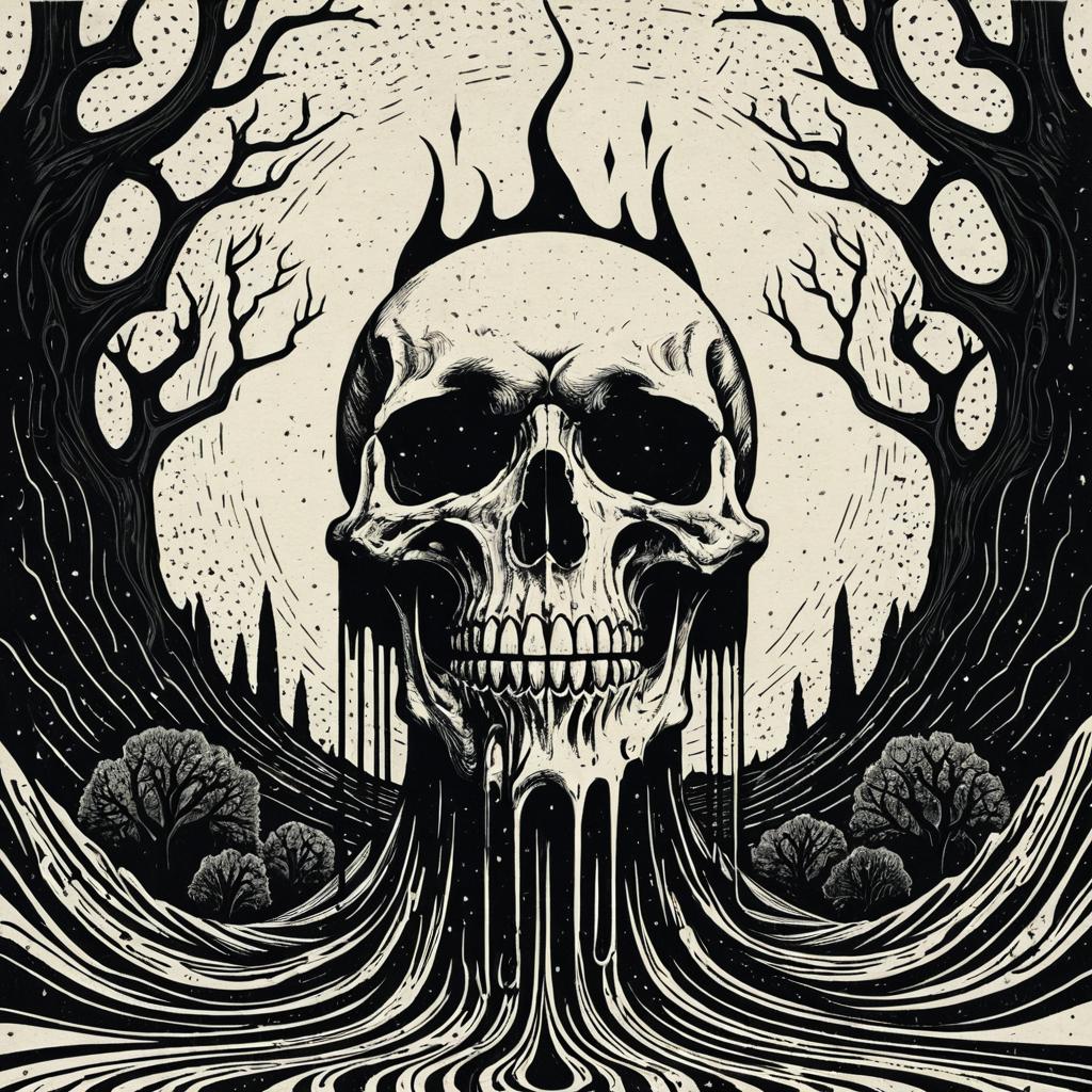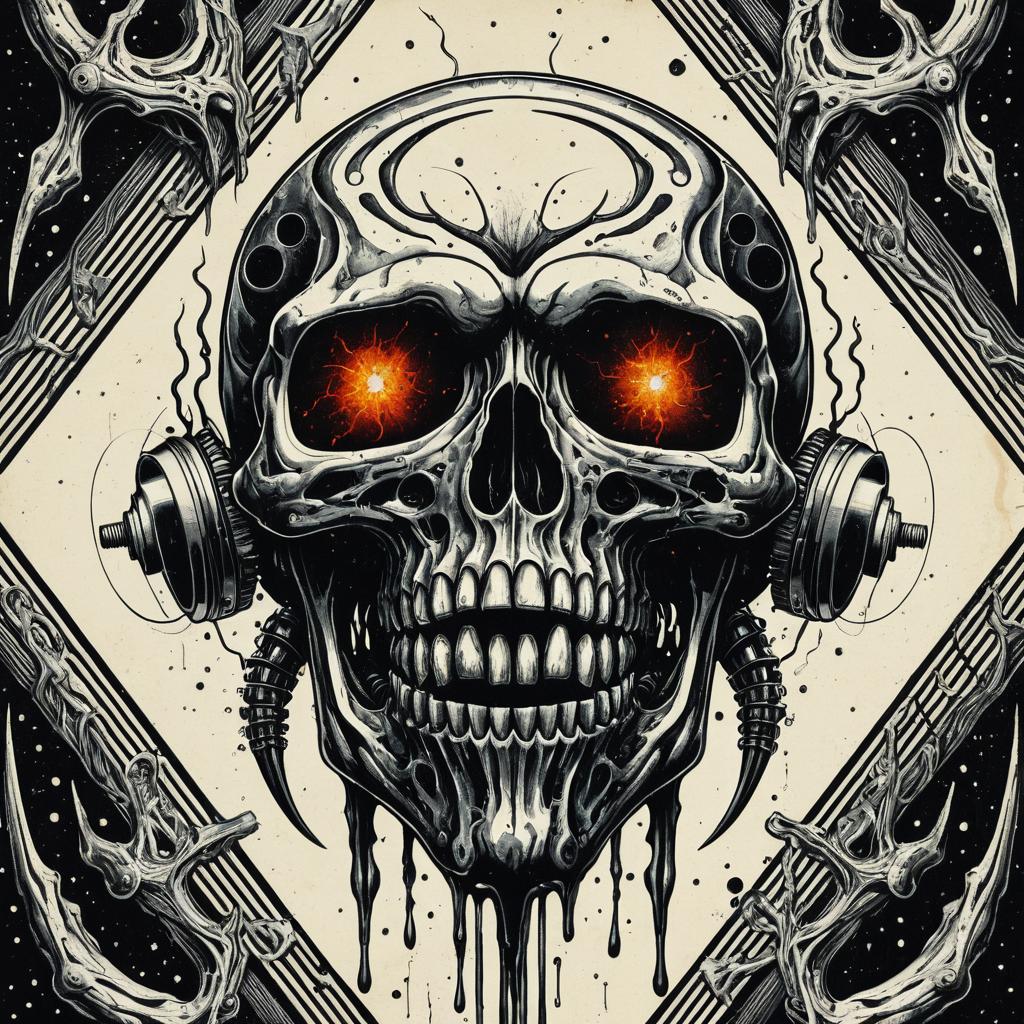 Highly detailed surreal biomechanical skull with glowing fiery eyes, melting and dripping with intricate mechanical elements. Rendered in monochrome with chrome tones on an old paper matte background featuring strong graphic lines and bizarre, freaky style. Perfectcore design influenced by Behance and modern screen print techniques.