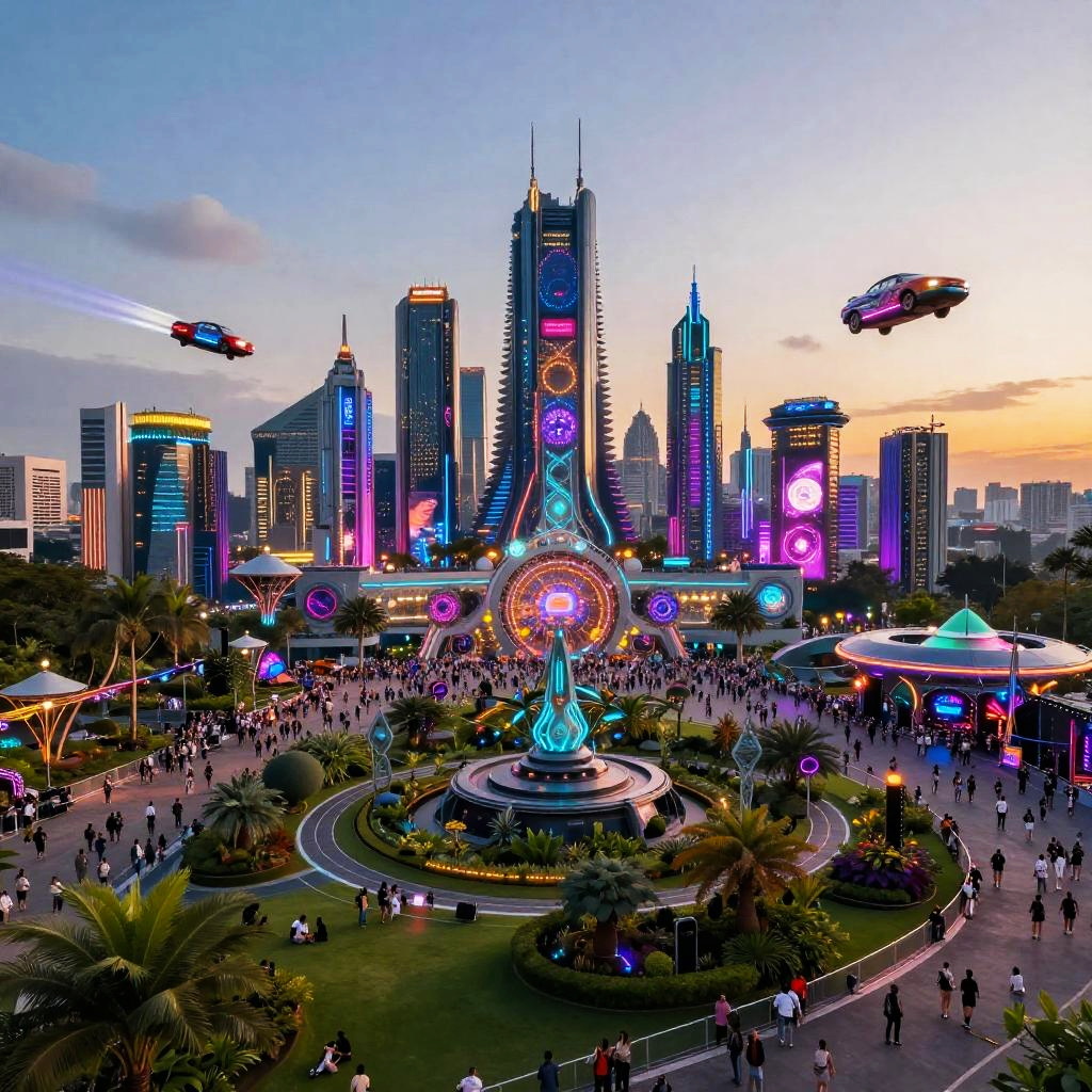 Tomorrowland Futuristic Cityscape at Dusk