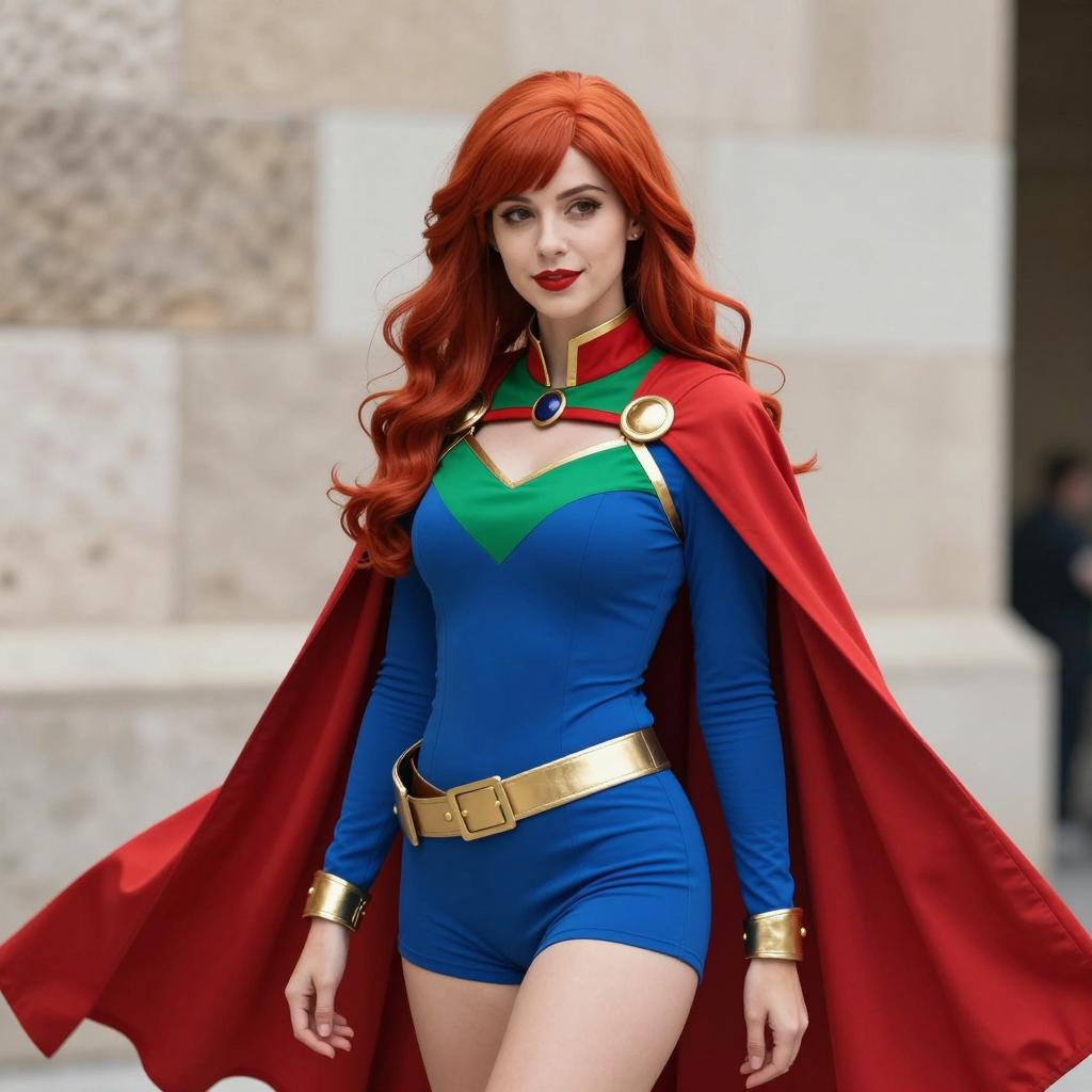 Portrait of a woman in a Miss Martian cosplay outfit featuring vibrant red hair, a tight blue and green costume with red and gold accents, a gold belt buckle, and a flowing red cape. The image has a shallow depth of field with a stone wall background.