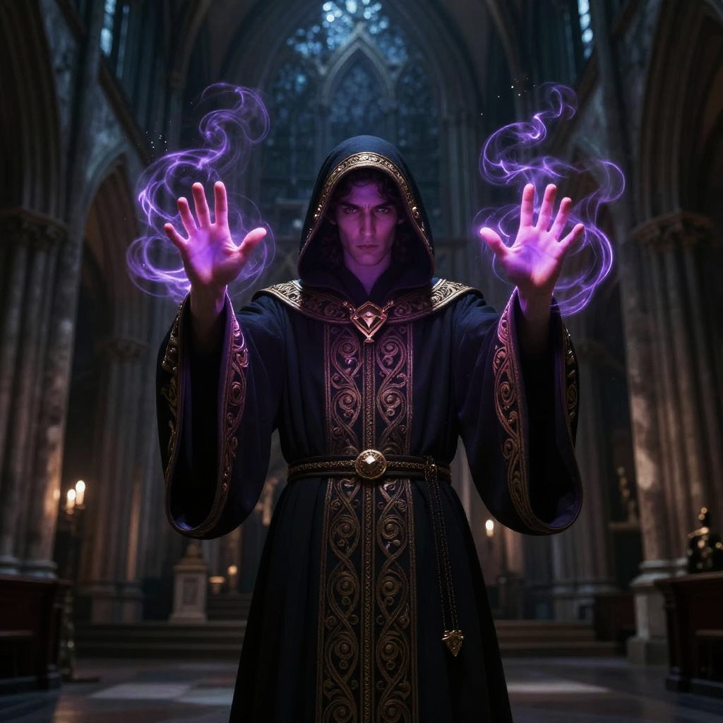 Robed figure casting a powerful spell in a dark gothic cathedral, swirling magical energy around hands, intricate robe patterns, dramatic lighting