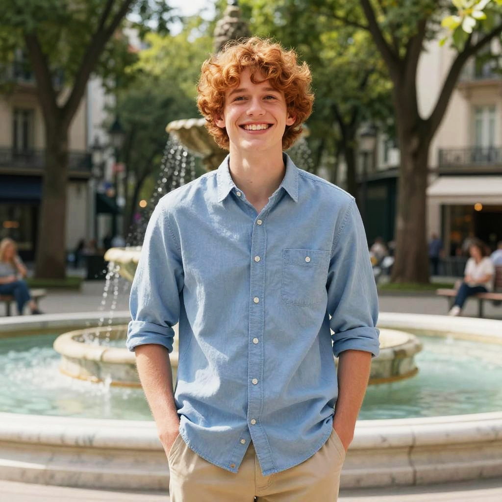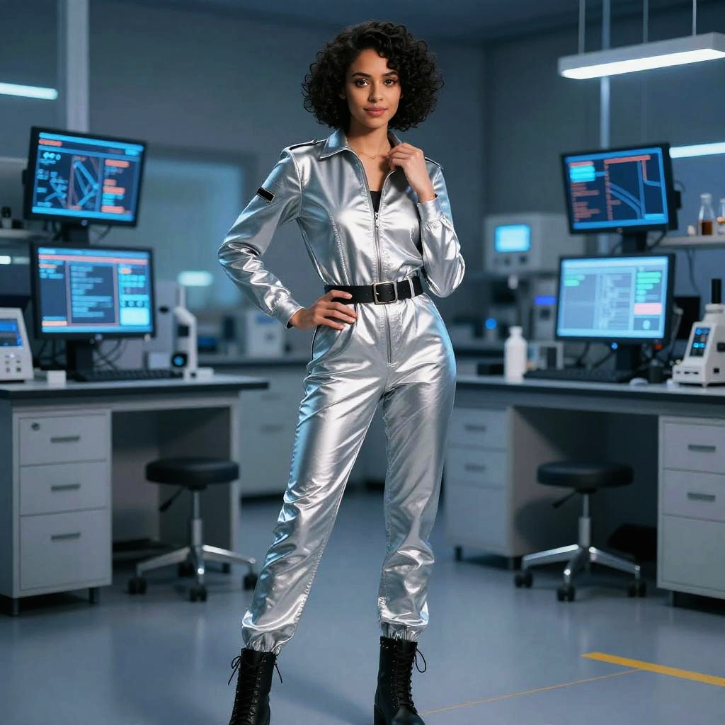 A cinematic portrait of a bold teenage girl with short pixie cut dyed teal wearing metallic silver bomber jacket with graphic tee and ripped jeans, standing in vibrant street market filled with colorful stalls at dusk, right hand on hip, left hand gently touching her collar, direct gaze, slight smile, dramatic studio lighting, crisp focus, photoreal detail, refined color grading.