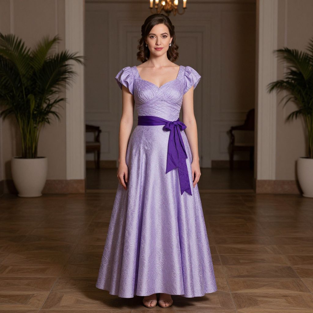 Regina Georges Mom Costume, woman in a purple dress with a purple sash