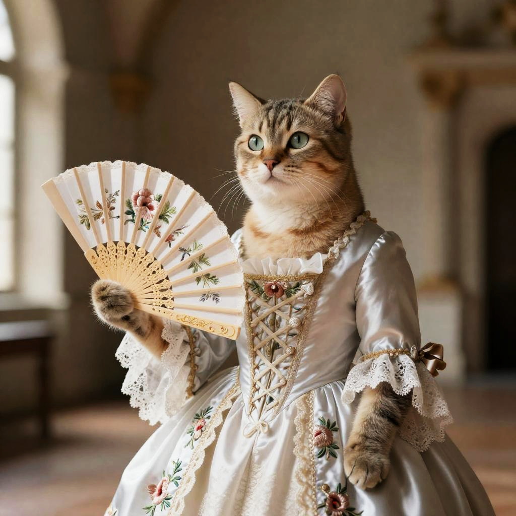 (a beautiful cat) wearing a 18th century dress, holding a fan in her hand, rim light, in a castle, embroidery, intricate details, taffeta, silk, white lace, photography, 4K, 8K, cinematic in sthe style of barry lindon, bokeh