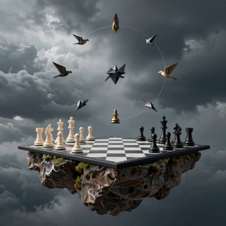 A floating island of chess pieces drifts through a stormy sky, pawns swimming in midair while rooks orbit in perfect geometric formations.