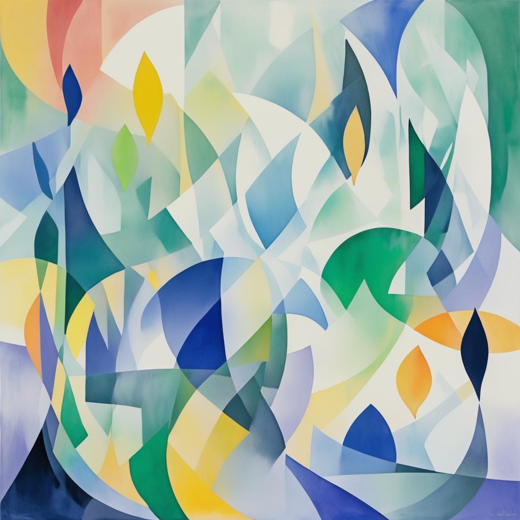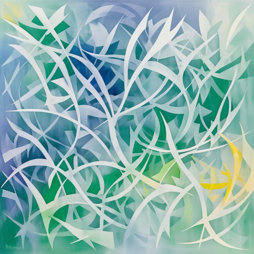 Abstract artwork featuring a chaotic yet harmonious composition of white, curved, and sharp-edged shapes over foggy, blended textures of blue, green, and yellow. The style is inspired by Henri Matisse, emphasizing freedom and movement through its symbolic and fluid forms.