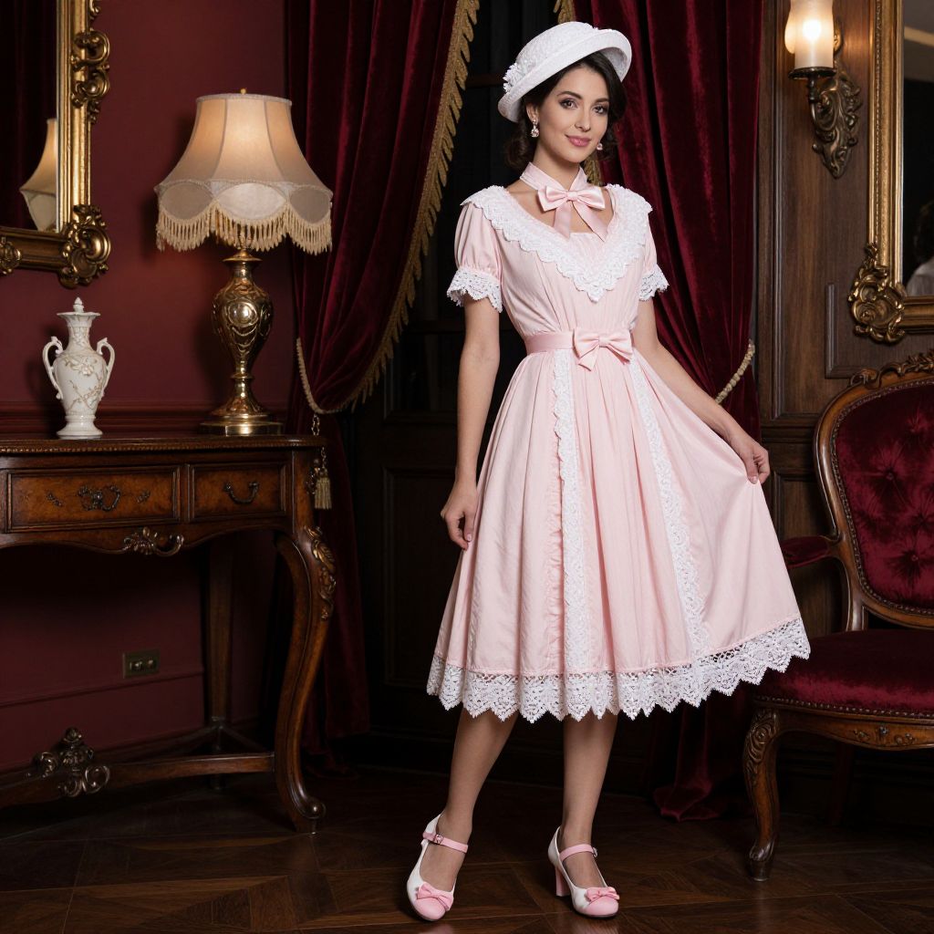 Elegant woman in a vintage-style pink dress with lace trim and a matching bow, accessorized with a white hat and pink-and-white shoes, stands gracefully in a richly decorated room featuring dark wood furniture, red velvet curtains, and ornate lamps.