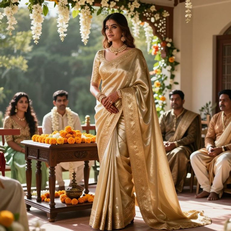 A graceful bride with medium brown hair and a serene expression is dressed in a rich, floor-length wedding silk saree below, the golden brocade fabric catching the sunlight streaming through a jasmine-covered balcony. She stands beside a vintage wooden altar decorated with marigold flowers, surrounded by traditional Indian wedding guests in traditional attire.