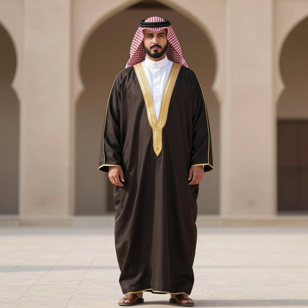 A Middle Eastern man wearing traditional Nawabi attire, including a black and gold thobe over a white shirt, and a red and white checkered keffiyeh. He has a dark beard and mustache, standing outdoors in front of a building with arched architecture. The image features sharp details and realistic lighting with a serious expression on the man's face.