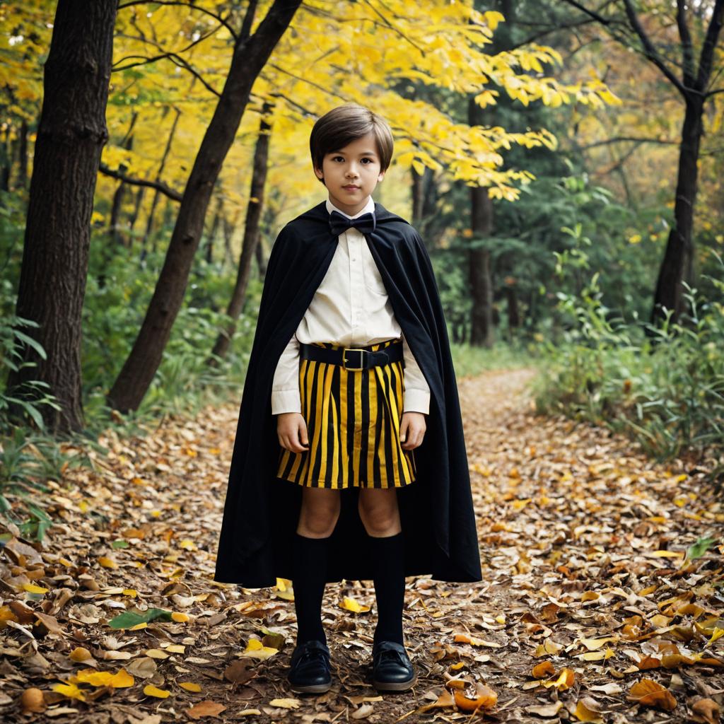 Satan costume boy, photograph of young boy with small red horns, white and red medieval-style tunic, red pants, serious expression, brown hair, outdoor background, grass, rocks, blurred trees, autumn colors, natural light, realistic style, T2I, child costume, front view