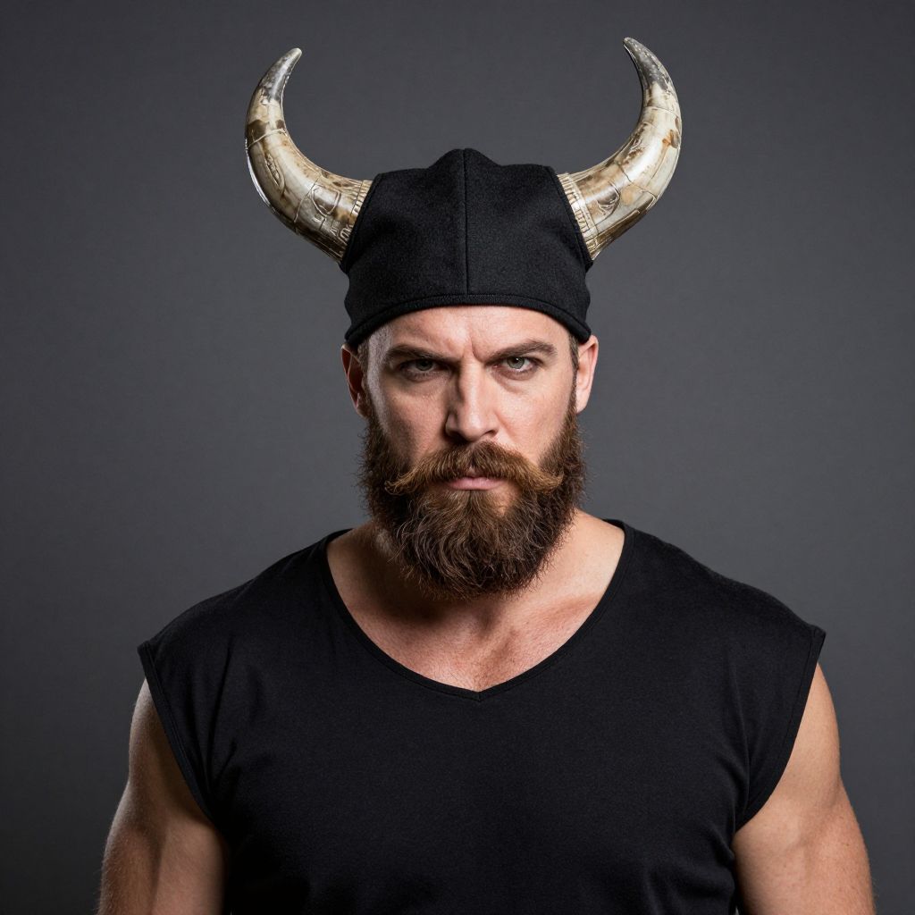 Photograph of a muscular bearded man with a serious expression, wearing a black shirt, and a black cap with large, metallic horns, against a