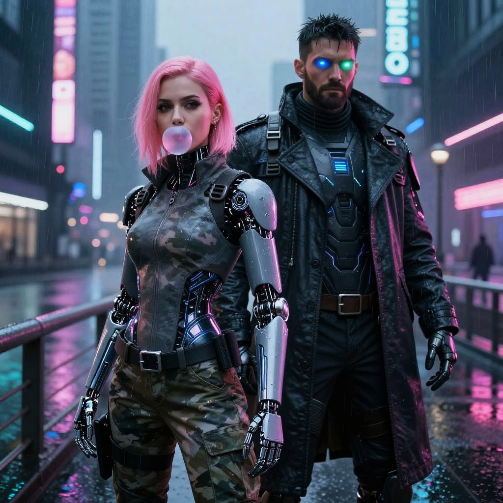 A cyberpunk scene featuring a sly female infiltrator with bubblegum pink hair and glowing cyberarms alongside a broad-shouldered male cyborg with iridescent eye implants, set in a rain-soaked neon bridge over glowing city river, wearing flexible urban camouflage and armored digital trench coat, hyper-realistic, ray tracing, dynamic lighting, high detail