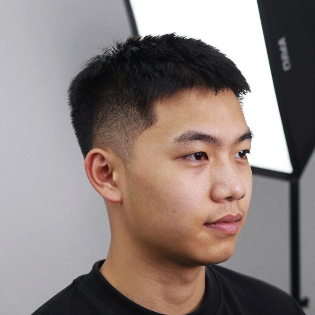 This photograph features a young Asian man with a light to medium skin tone and short, black, neatly trimmed hair with a slightly buzzed sides. He has a round face with small, slightly upturned eyebrows, dark brown eyes, and a neutral expression with slightly parted lips. He is wearing a plain black t-shirt. The background is minimalist, with a white wall and a large, rectangular, black and white light source on the right. The lighting highlights his facial features and hair texture. The overall image has a crisp, professional quality, focusing on the subject's face and upper shoulders.