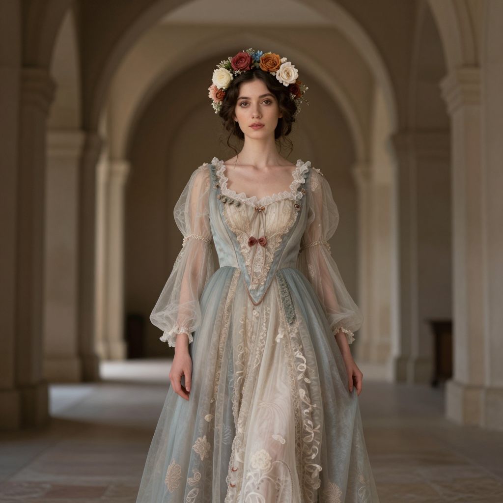 Photograph of a pale-skinned woman with dark, wavy hair wearing an elaborate, historical-style gown in soft pastel blue and white. The dress features puffed, sheer sleeves, intricate lace detailing, and a deep V-neck adorned with a pink ribbon. She wears a floral crown with red, white, and pink flowers. The background shows a dimly lit, arched hallway with stone columns, creating a medieval or Renaissance ambiance. The woman's expression is serene, and she stands centered, looking directly at the camera. The overall scene exudes a timeless, romantic elegance.