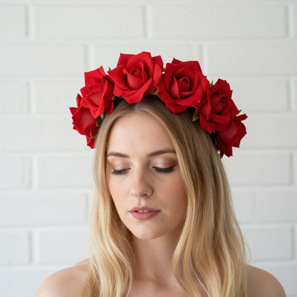 Blonde woman wearing a handcrafted red rose flower crown featuring six vibrant red roses, styled as a romantic halo against a clean white brick background.
