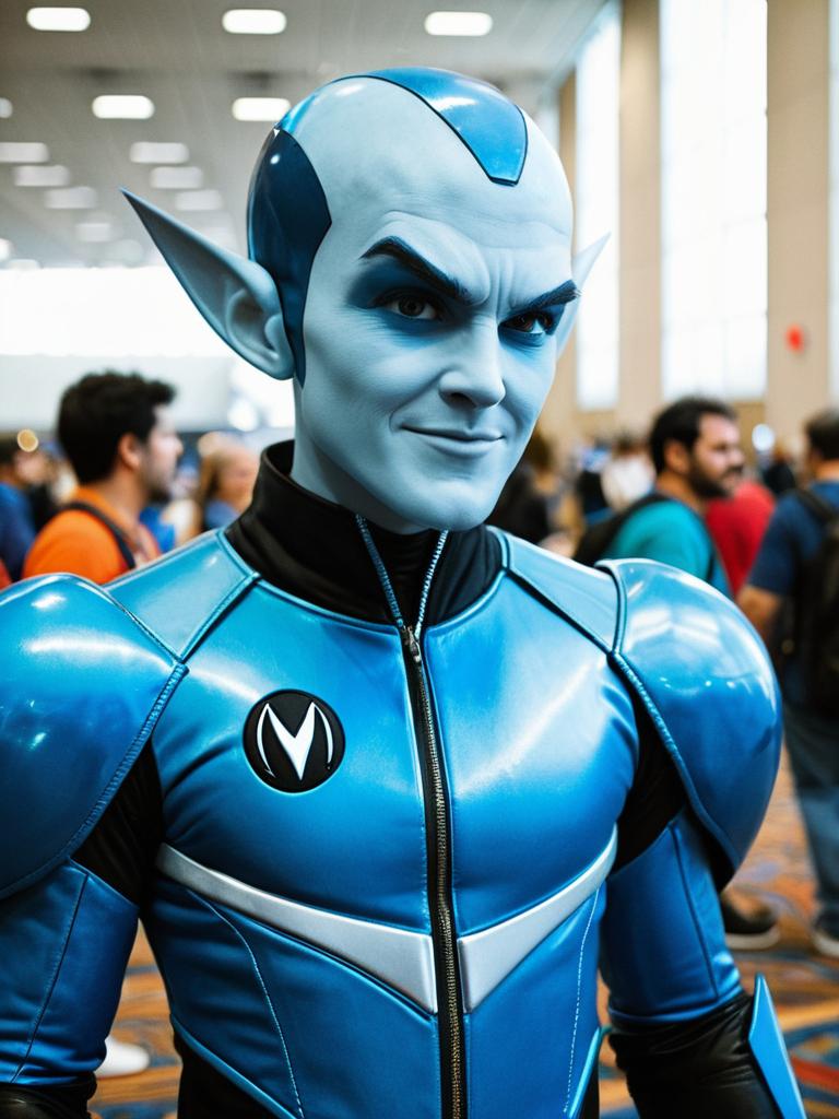 Candid portrait of a man dressed as Megamind, a blue-skinned fictional character with a large bald head and pointed ears. He is wearing a black suit with blue accents and shoulder armor, posing confidently at a comic convention with blurred attendees and booths in the background under bright indoor lighting.