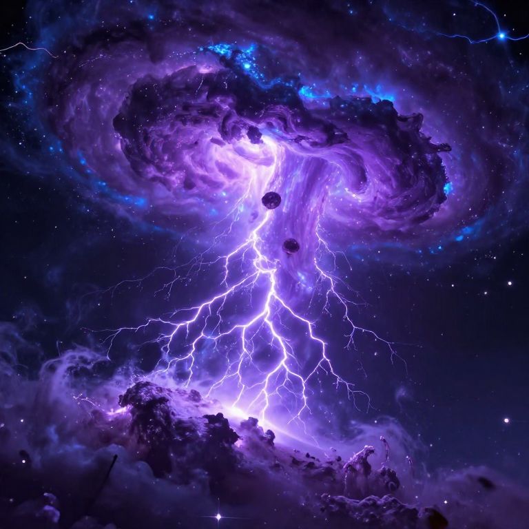 A negative ion storm in an alien atmosphere, glowing charged particles crackling through the air, vibrant purples and blues, sci-fi illustration with dynamic energy and intricate textures.