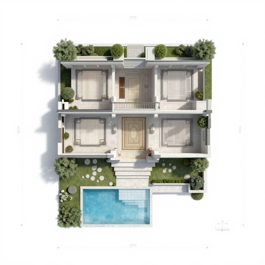 Top-down 3D floor plan of a luxury villa showcasing a multi-level layout with four distinct rooms, elegant outdoor gardens, and a rectangular swimming pool. The design includes detailed dimension markings in feet and meters, shadowed walls for depth, and a clear presentation of outdoor green spaces surrounding the structure. The villa features stair access to the pool area and ornamental plants integrated into the garden.