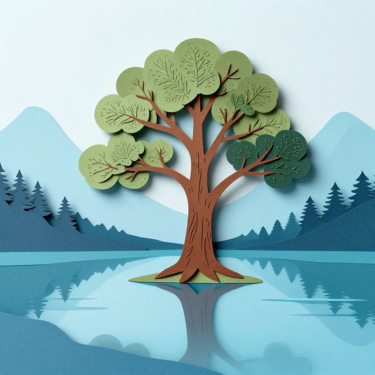 Laminated a single great tree in the center, mountains in the background, lake surrounding tree, cool colors, paper art, reflections in water,