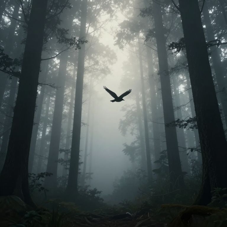 Photograph of a misty, dense forest at dawn, with tall, dark, silhouetted pine trees dominating the background. A single bird with outstretched wings is centrally flying upward, illuminated by soft, diffused sunlight breaking through the fog. The forest floor is covered in shadowy underbrush and scattered rocks. The atmosphere is mysterious and ethereal, with the mist creating a gradient of light from bright white at the top to darker blue-gray at the bottom. The overall mood is serene yet haunting.