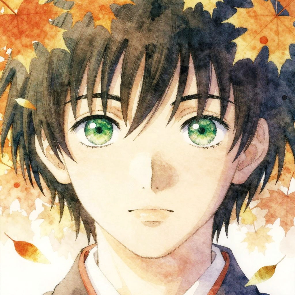Artistic close-up of a Japanese with striking green eyes, surrounded by falling autumn leaves, soft watercolor style, delicate brush strokes highlighting facial features