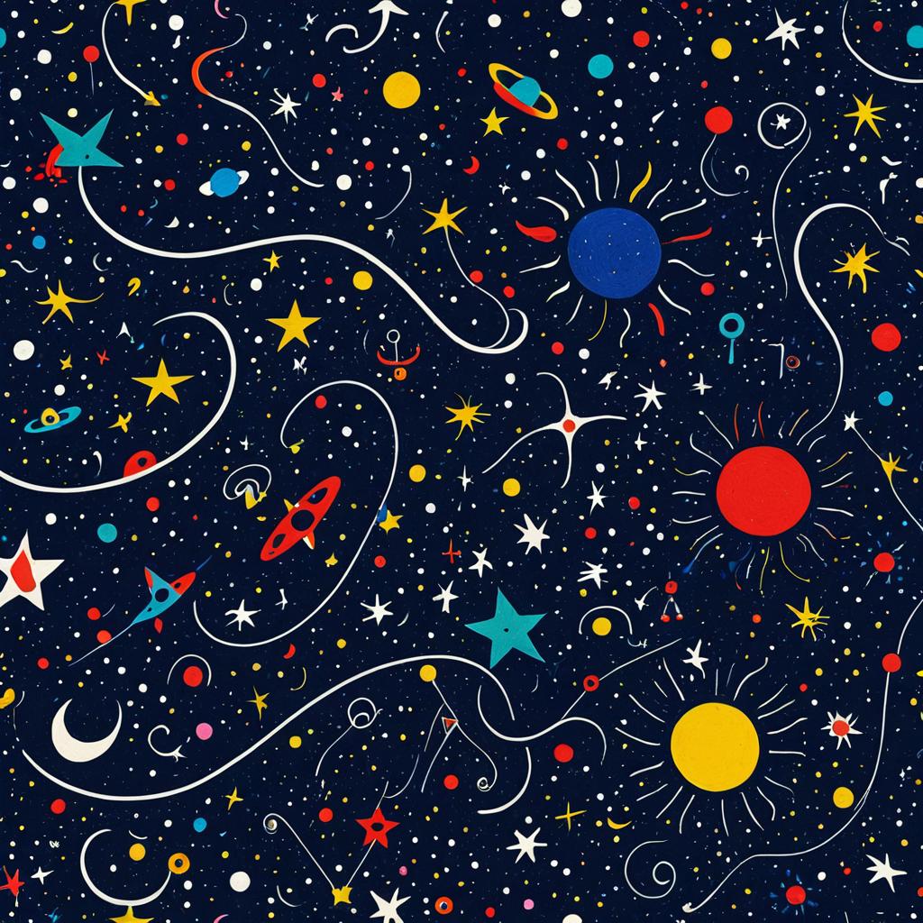 Artwork inspired by Joan Miró style, showcasing an abstract cosmic festival, with floating figures, sweeping curves, and scattered stars, in an infinite dark blue cosmos, rendered in bright primary colors with black accents, exuding a whimsical and nostalgic tone