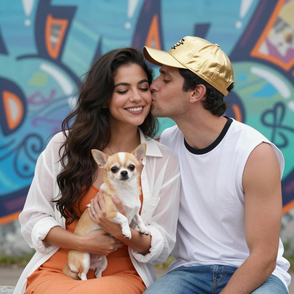 Woman with long dark hair, wearing sheer white blouse over orange top, holds small tan and white chihuahua. Man with short dark hair, wearing white sleeveless shirt with black trim, kisses her cheek. Vibrant graffiti wall in background. Both seated, woman on left, man on right. Woman smiles, man smiles slightly. Chihuahua looks alert. Man wears gold cap. Graffiti includes blue, orange, and teal colors.