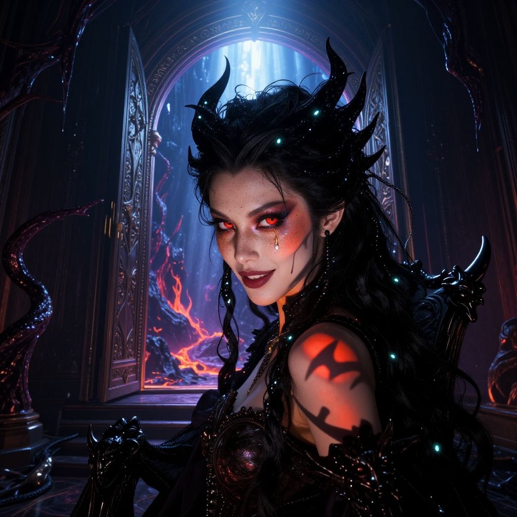(((full body:3))), a soul eater basking in a beam of celestial light piercing through a dark and gloomy room in the warlock's castle. Behind her, a portal shimmers, its arch glowing with sapphires and engraved silver runes. The portal door stands open, revealing a glimpse of a sultry, volcanic hell-scape. Eerie tendrils of darkness and liquid metal snake from the portal, adding to the unsettling atmosphere.Playful shadows dance across the soul eater's face, highlighting a dusting of sun-kissed freckles and iridescent party makeup. A single teardrop of molten gold traces a path down her cheek. Her majestic black hair, woven with strands of obsidian and imbued with an inner glow, cascade down her back.a mischievous grin that hints at both playful cruelty and undeniable charisma. Her piercing eyes, like pools of molten ruby, radiate an otherworldly allure. Casting seat, adorned with demonic visages and crafted from obsidian, hints at her power.futuristic, scifi, intricate, elegant, majestic, Masterpiece;highly detailed; extreme, octane render, zbrush, blender, 3d, post-processing, HDR; lightning; volumetric; cinematic; ray tracing; RTX;radiant light rays, subsurface scattering, soft edge lighting, realistic shadows; vibrant colors, high-res, 8k, 16k, 32k