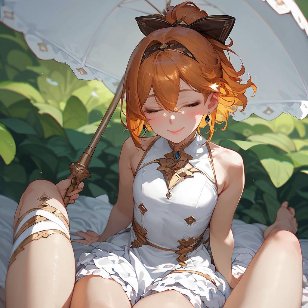 Score_9, score_8_up, score_7_up, very aesthetic, source_anime, detailed, high quality, beautiful, masterpiece, blurry background, cowboy shot, close up, first person view, from belowflat chest, naughty smile, feet focused, sitting, half eyes closed, short hair, blonde hair, multicolored hair, orange hair, high ponytail, blue eyes, hair between eyes, white dress, sleeveless dress, leg ribbon, brown hairband, green hair ribbon, umbrella, feet, zPDXL