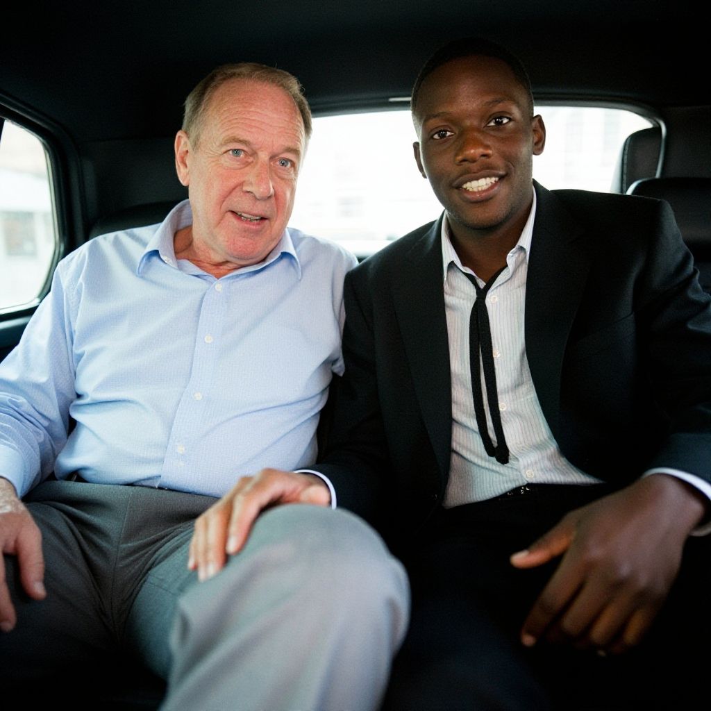 A morning tte--tte, a shirt and pants wearing older white Caucasian businessman sits next to his skinny 20yo African twink executive assistant in the back of a limo, smiling, thick wet parted lips, bulging crotch, RAW photo, photorealistic, film grain, candid camera, color graded cinematic, eye catchlights, macro shot