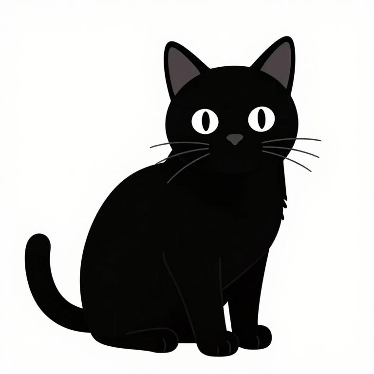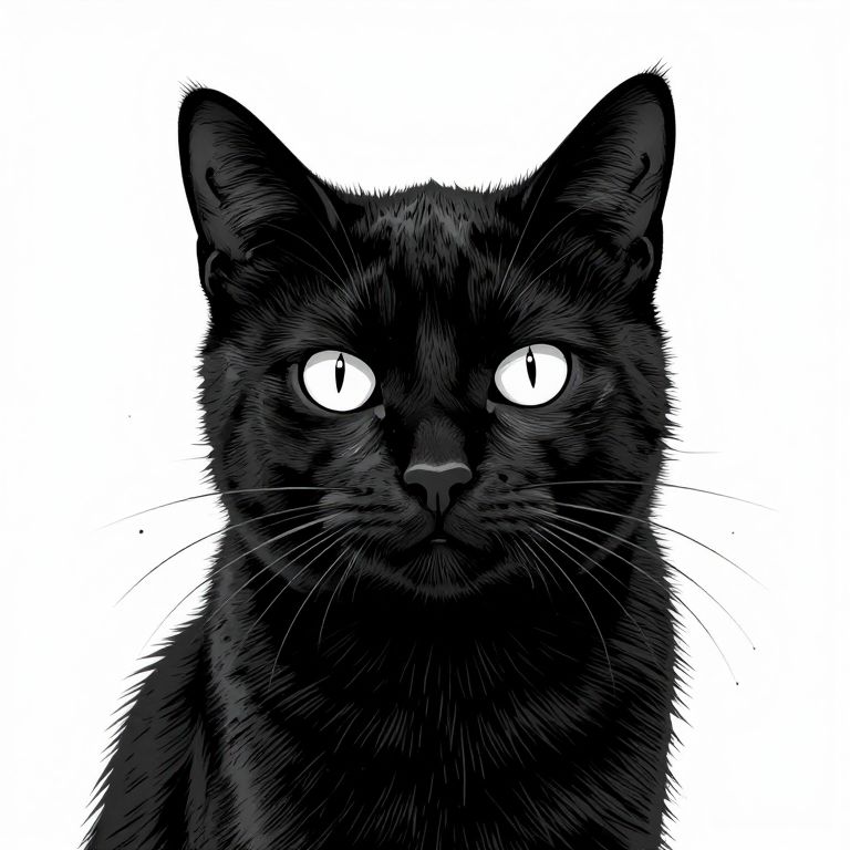 This digital drawing depicts a black cat with striking white, almond-shaped eyes that stand out against its dark fur. The cat's fur is detailed with fine, black lines, giving it a slightly textured appearance. Its ears are upright and pointed, and its whiskers are prominently visible. The background is entirely white, making the cat the focal point of the image. The cat's expression is neutral, and it gazes directly at the viewer, creating a sense of direct engagement. The art style is reminiscent of comic book or graphic novel illustrations, using bold contrasts and clear lines.