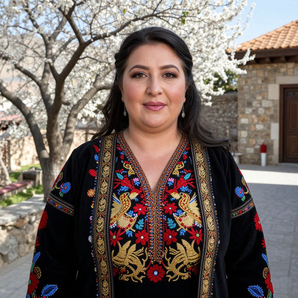 A realistic photograph of an Armenian folk woman in her 40s with deep brown eyes, high cheekbones, and a warm, serene expression, wearing a traditional embroidered cotton dress with intricate patterns of birds, flowers, and geometric designs in red, gold, and blue, standing in a sunlit courtyard of a historic village in Armenia, surrounded by flowering cherry trees and ancient stone walls, the embroidery on her dress showing vibrant heritage details from the highlands.. The woman has big tits and cute face