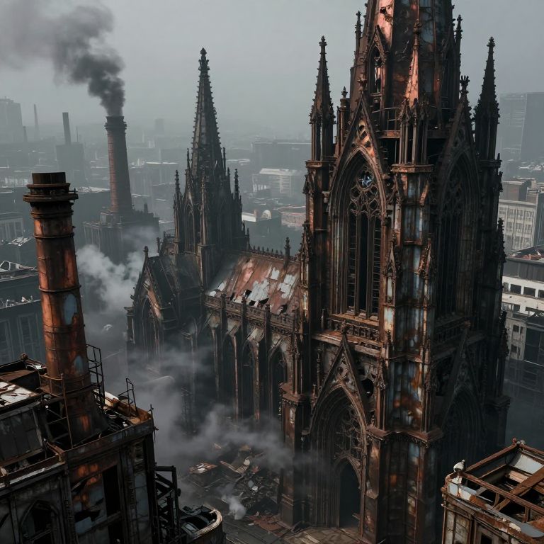 The image presents a dystopian, decaying cityscape viewed from an elevated perspective, showcasing a complex machine-like structure that resembles a gothic cathedral. The scene is dominated by tall, rusted iron and copper buildings adorned with intricate baroque designs, exuding an industrial punk aesthetic. Smoke billows from numerous chimneys, adding to the hazy, steamy atmosphere. The city is bathed in a dim, overhead grey lighting, creating a somber and oppressive ambiance. The buildings are arranged in a chaotic yet structured manner, with some appearing to be in ruins, while others stand tall and imposing. The overall composition is dynamic, with elements both in the foreground and background, creating a sense of depth and scale. The interplay of colors, textures, and shapes contributes to the overall sense of decay and industrial decay, evoking a sense of a bygone era.