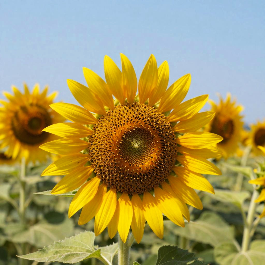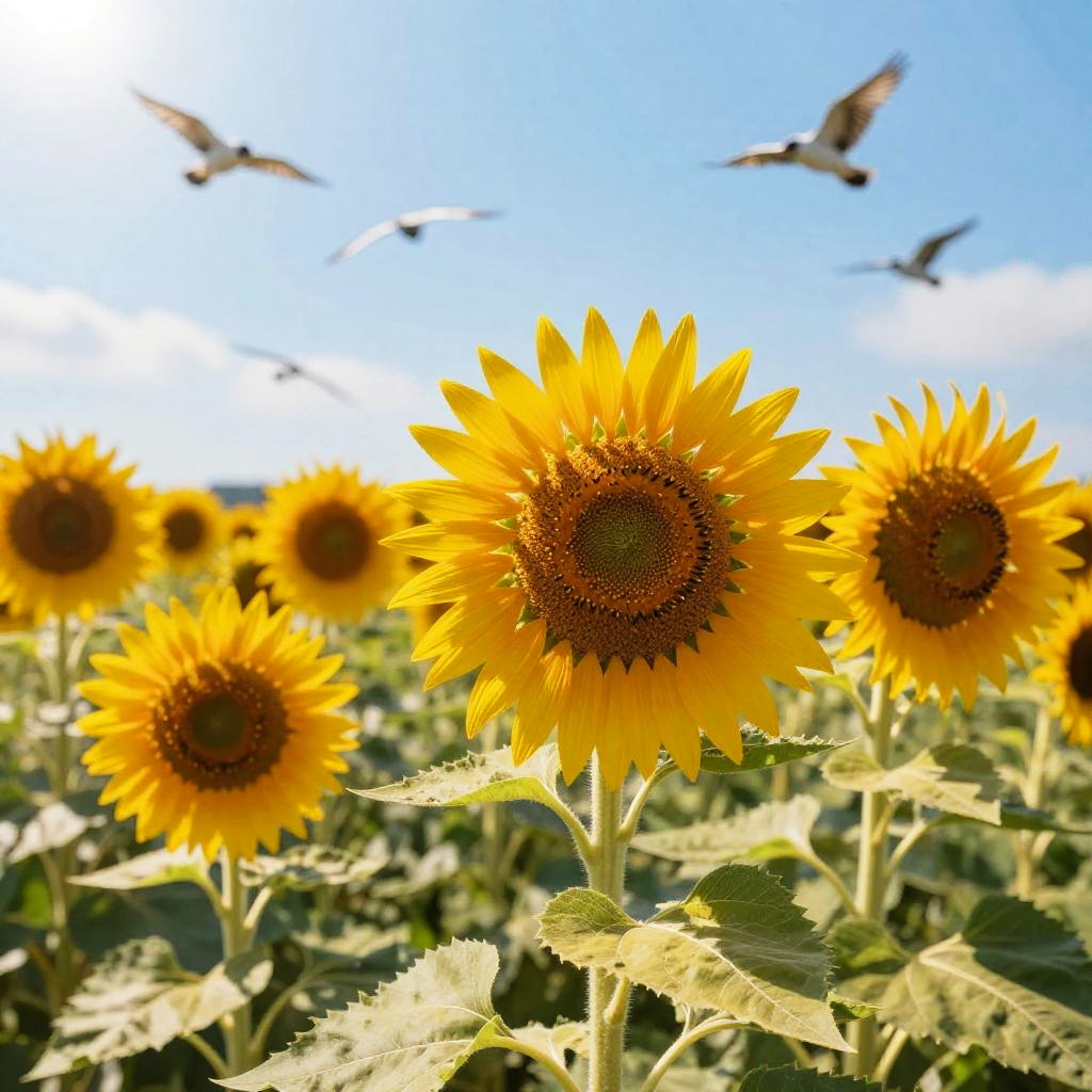 Himawari, vibrant field of sunflowers under a bright blue sky, golden petals glowing in the sunlight, gentle breeze moving the flowers, detailed close-up of sunflower heads with intricate textures and natural shadows, summer warmth ambiance
