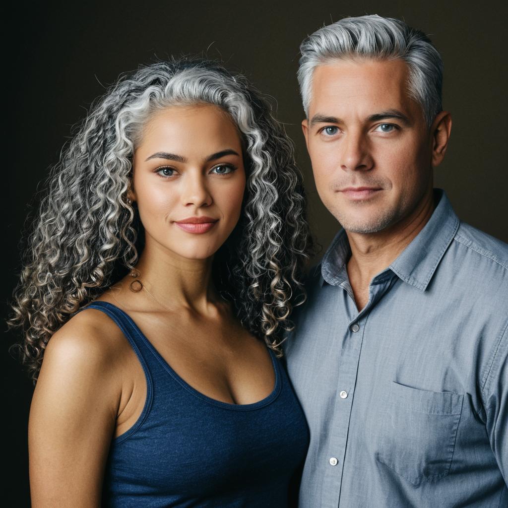 Neo-Traditional A photorealistic full bodied image of a male in his mid-fifties. Still youthful looking and handsome. He has white skin, blue eyes, straight gray hair, clean shaven and a fit build. Hes standing with his beautiful 18 year old bi-racial daughter. She has light brown skin, long curly hair, with a look of sophistication about her.,