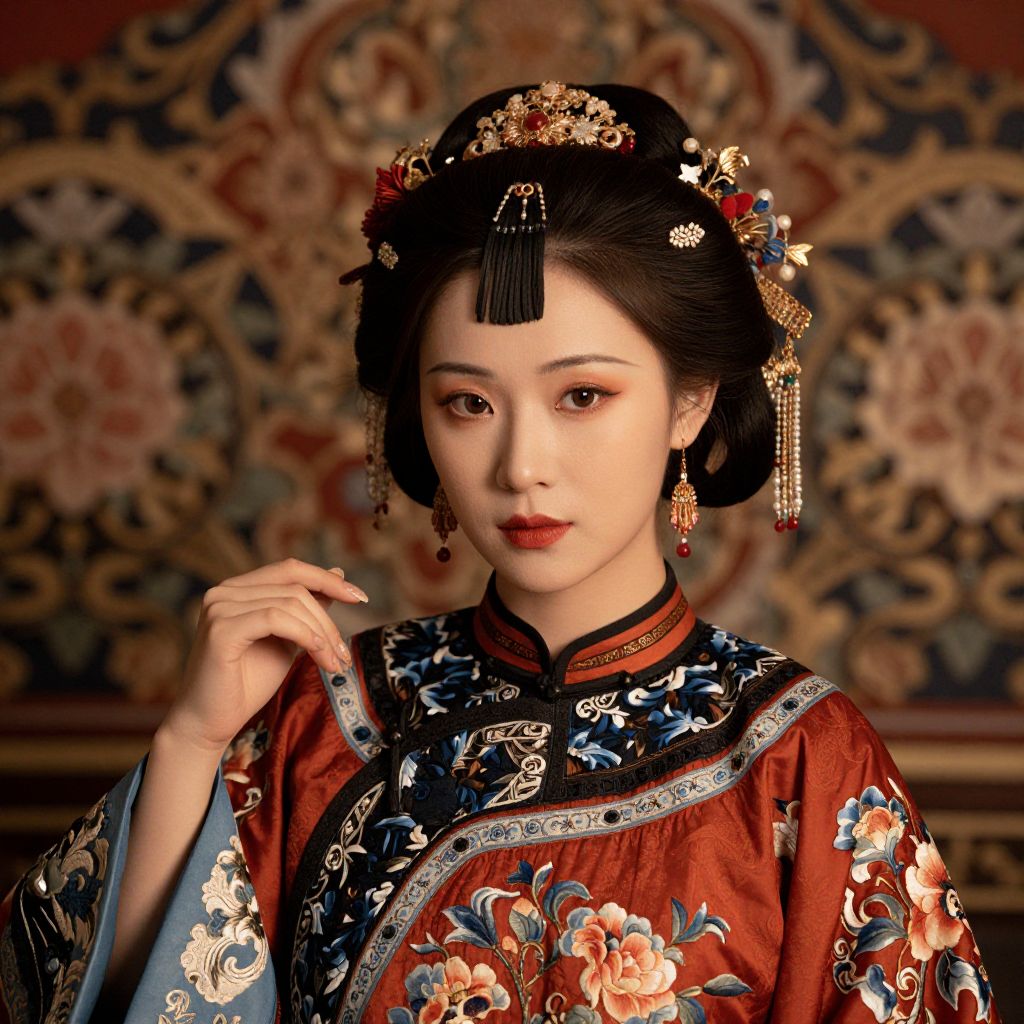 A beautifully adorned Asian woman in traditional attire, surrounded by intricate floral patterns and luxurious materials.