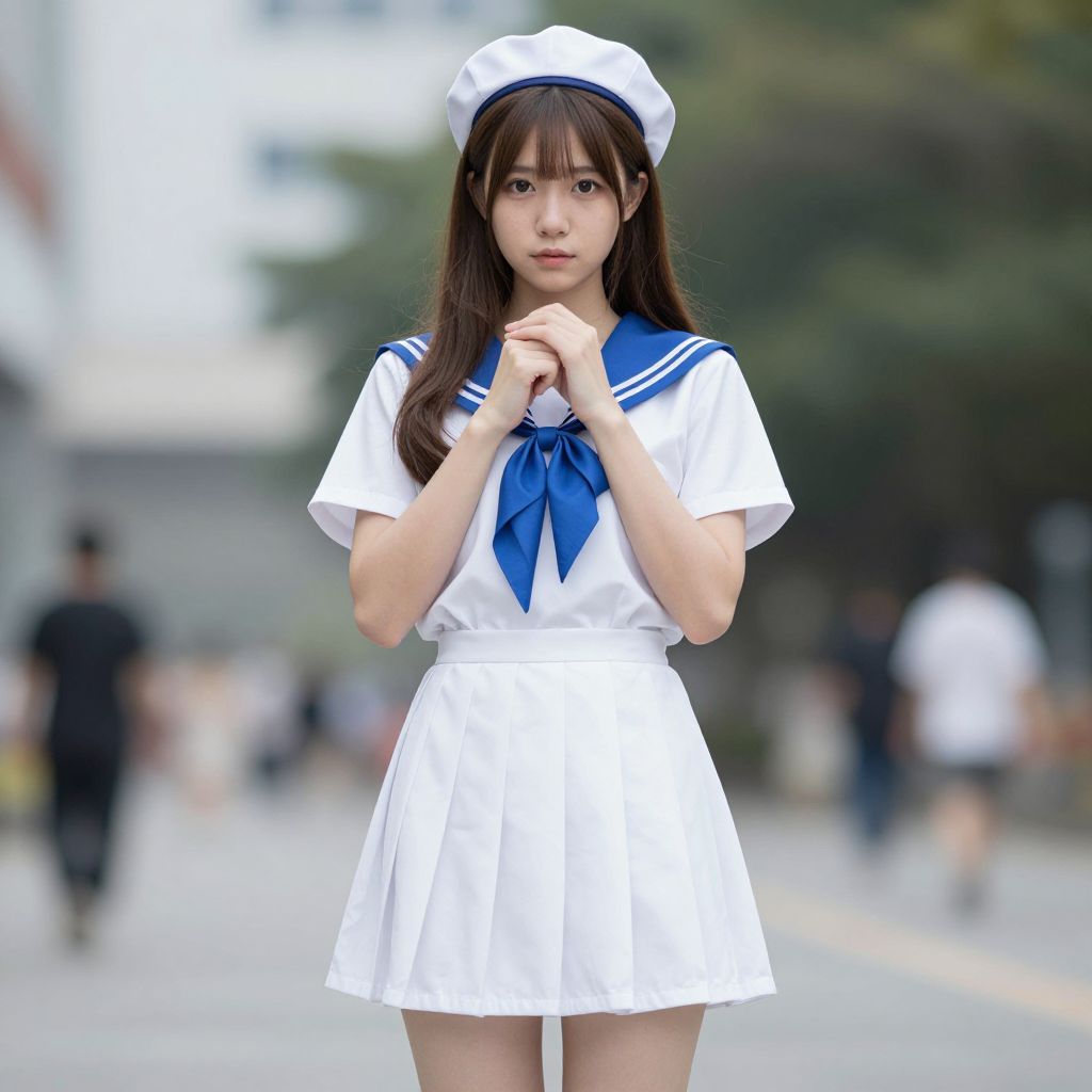 Sailor costume woman fancy, 1girl, solo, hat, sailor hat, sailor collar, blurry background, blue neckerchief, blurry, looking at viewer, neckerchief, outdoors, white skirt, blue sailor collar, long hair, short sleeves, brown hair, closed mouth, own hands together, standing, dress, shirt, skirt, white headwear, white shirt, white dress, asian, realistic, serafuku, feet out of frame, sailor dress
