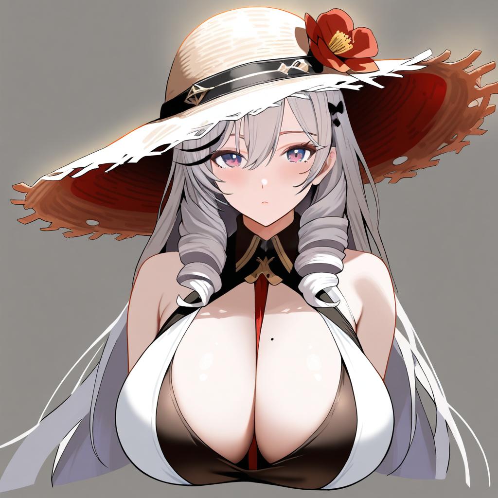 Algerie (azur lane), azur lane, 1girl, purple eyes, hair between eyes, mole under eye, grey hair, long hair, very long hair, white hair, large breasts, mole on breast, cleavage, white bikini, two-tone bikini, straw hat, hat flower, bare shoulders, twin drills, drill sidelocks, by artist naidong (artist), animagine