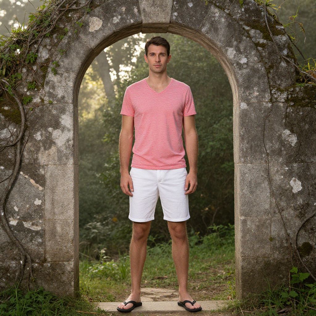 Photograph of a tall, handsome man with short brown hair, standing in front of an old, stone archway. He's wearing a pink, short-sleeve, v-neck t-shirt, white shorts, and black flip-flops. His expression is neutral, and he's looking straight at the camera. The background is a misty, green forest with sunlight filtering through the trees. The stone arch has patches of moss and vines.
