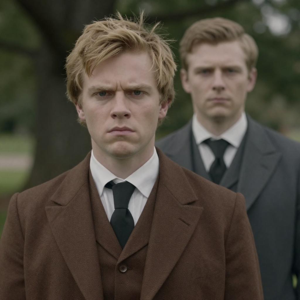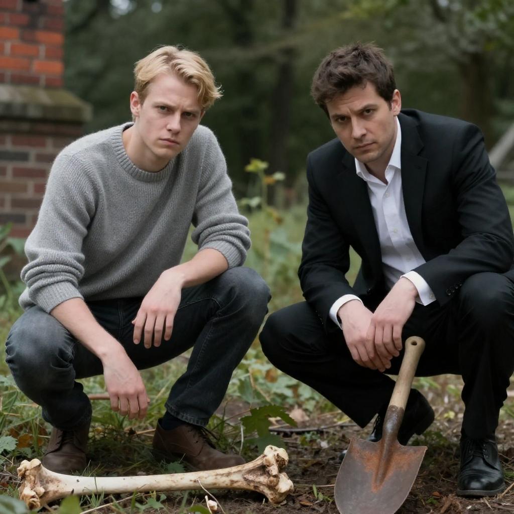 Two serious young men crouching outdoors in a forest-like setting. The man on the left has blonde hair, wearing a grey knit sweater and dark jeans, with a hand resting on his knee. The man on the right has dark hair, dressed in a black suit and white dress shirt, holding a rusty shovel planted in the ground. In front of them, there is a large, weathered bone on the ground amidst overgrown greenery and a brick chimney partially visible in the background.