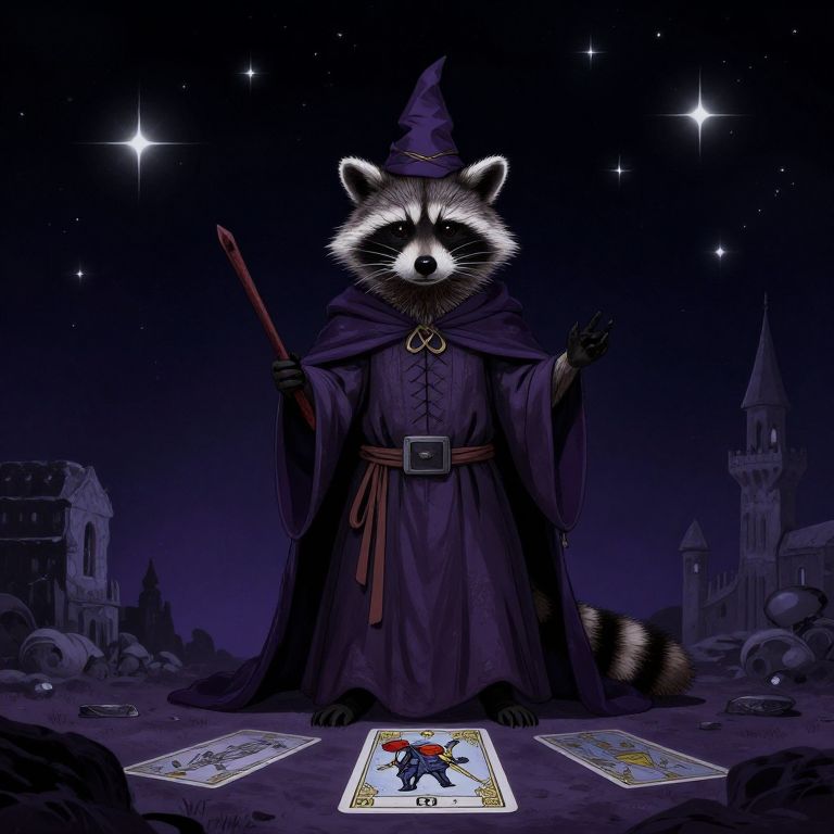Crosscutting a humanoid racoon, dressed as wizard, starry sky, majestic, gloomy, tarot, illustrated,