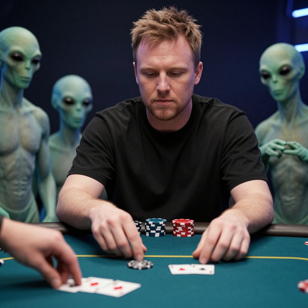 Photograph of a bearded man in a black shirt, playing poker at a green table with three green-skinned, humanoid alien figures in the background