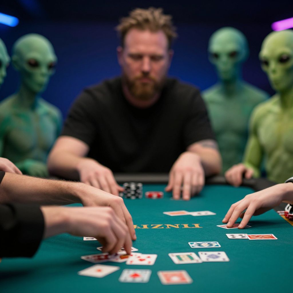 Photograph of a poker game in a dimly lit room. Centered is a bearded white man with short brown hair, wearing a black shirt, focused intently on the green-felt poker table. His hands are dealing cards. Surrounding him, slightly blurred, are three green-skinned, bald humanoid aliens with muscular chests, standing in a row. The table is scattered with poker cards, including aces, kings, and numbered cards. The background is dark with blue and purple lighting, creating a mysterious and tense atmosphere. The image emphasizes the contrast between the human player and the alien observers.