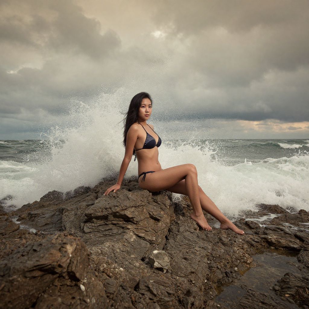Photograph of a dark-haired woman in a black bikini sitting on rocky shoreline, waves crashing behind her, cloudy sky overhead.